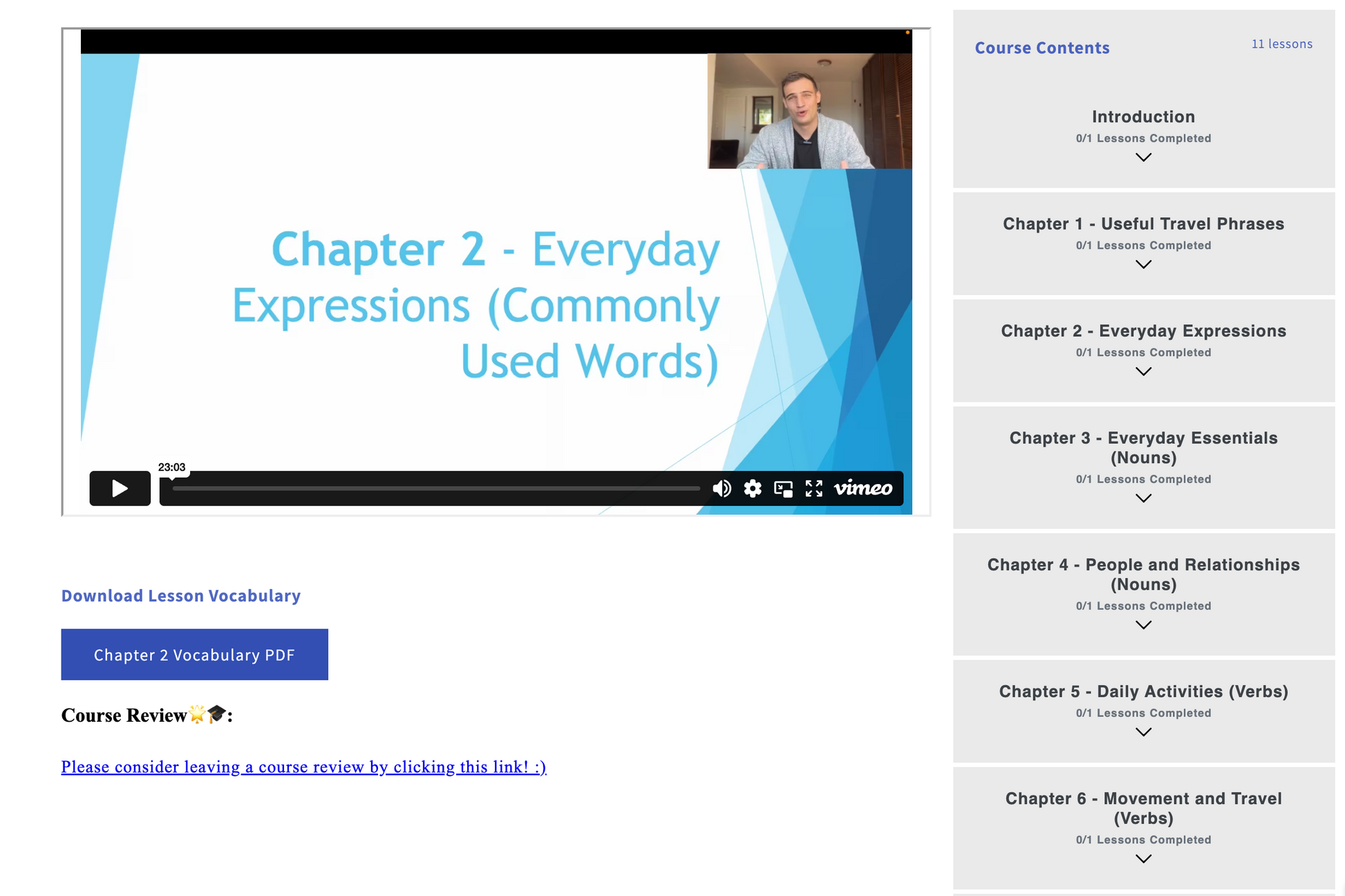 I’ve only just started but I already feel the course is very well structured and Dimitri keeps it simple and clear. I will be making another review once I’m more advanced and starting to benefit from the lessons! Anyhow, as a teacher I can tell the suggested method is very sensible and the lessons are short enough to make anyone focus.